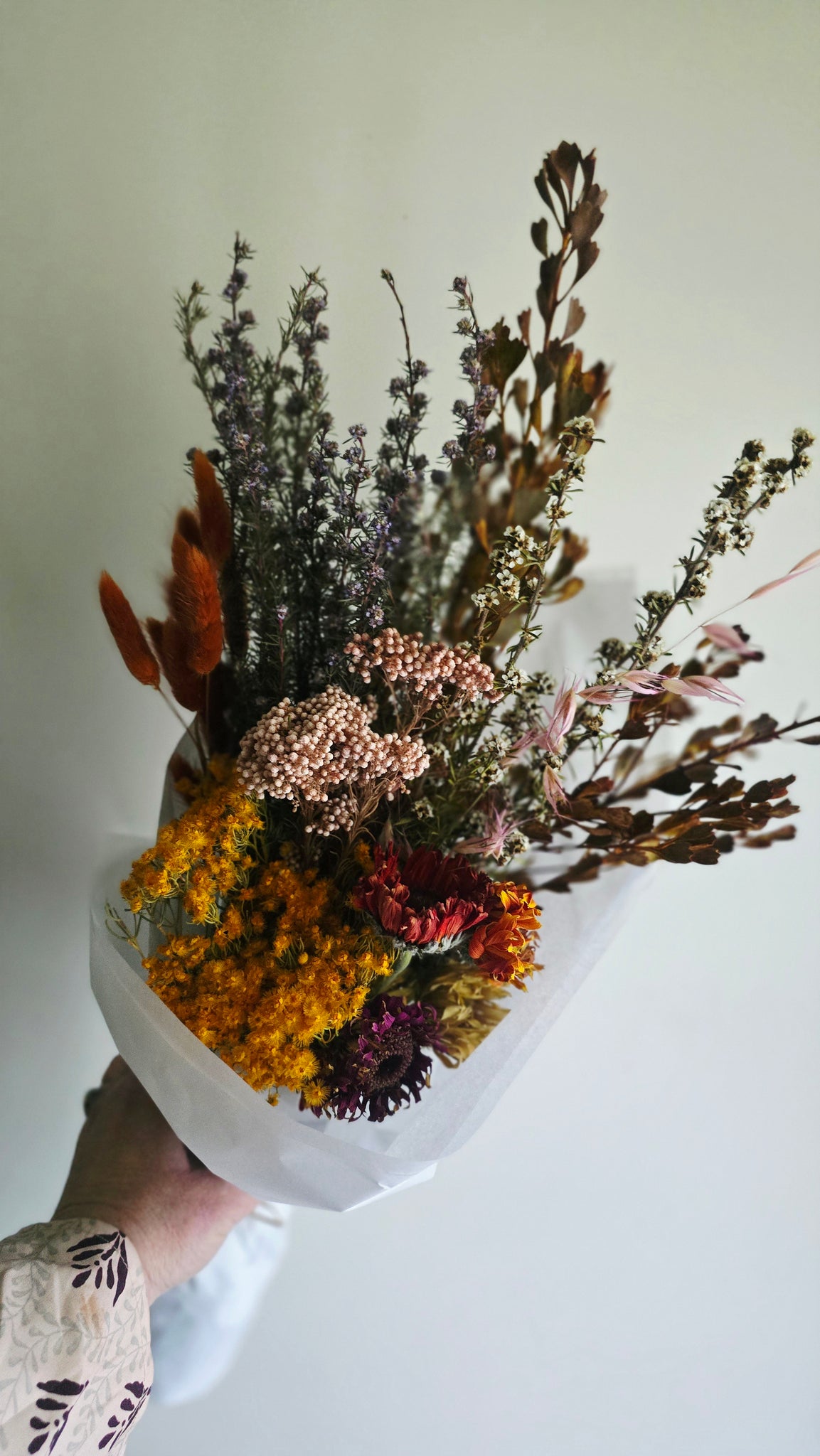 Mini wildflower, native and preserved  posy's in blue, pink or burnt Orange and Yellow. Celebrate some botanical goodness with our mini posies, perfect for a quick gift or to brighten up a little spot in your home, featuring carefully choosen florist choice blooms from both our garden and our wholesalers these are the perfect little something that brings the gift of nature.